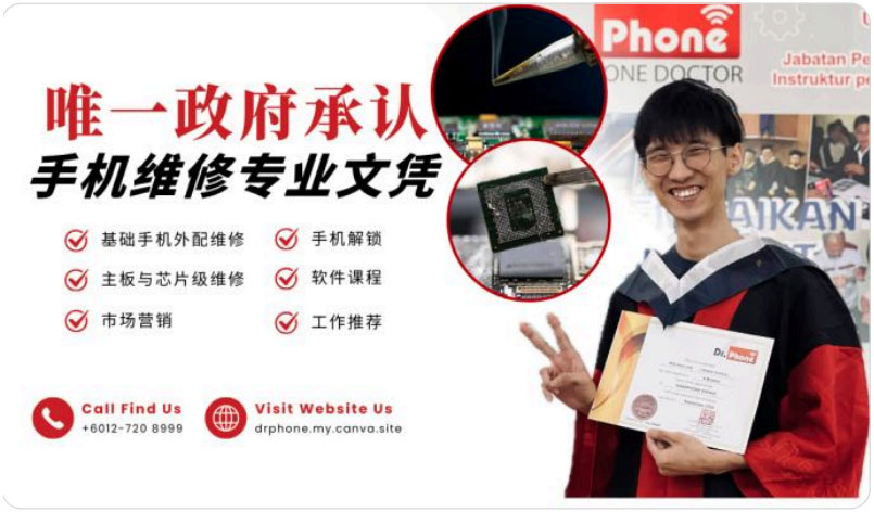 也因这份专业与坚持,Dr. Phone 成为全马唯一同时具备 政府认证+国家审查资格+专业师资认证的手机维修学院。
